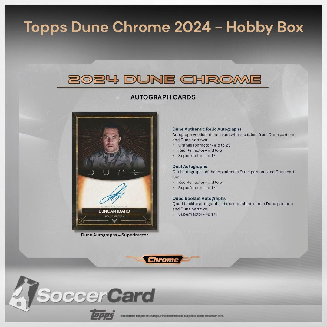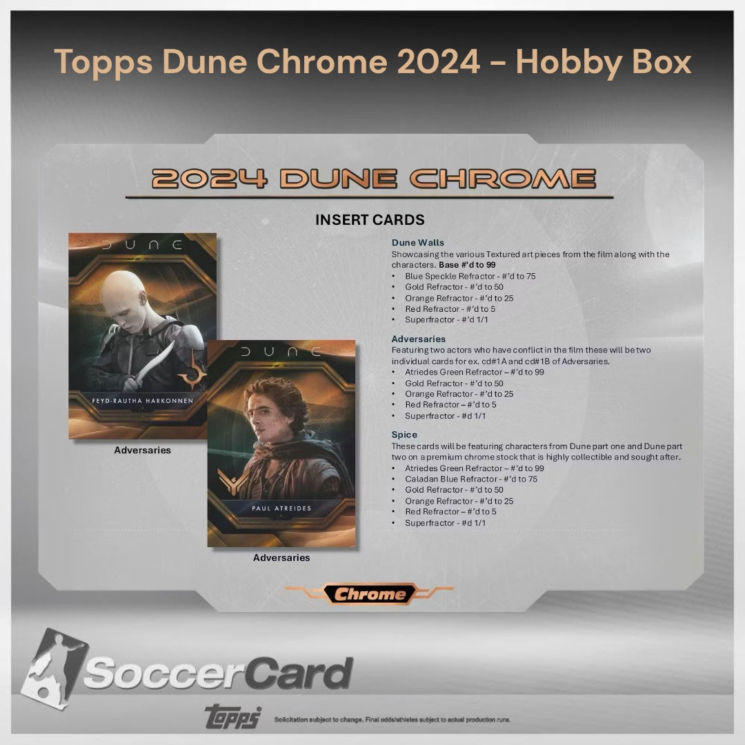 2024 Dune Chrome® marks the first-ever Chrome® trading card product from the 6-time Academy Award winning film, bringing the epic world of Arrakis to collectors in stunning Chrome® style. Packed with elite talent autographs, innovative card technology, and unforgettable chase hits, this release is destined to be a cornerstone of any collection.